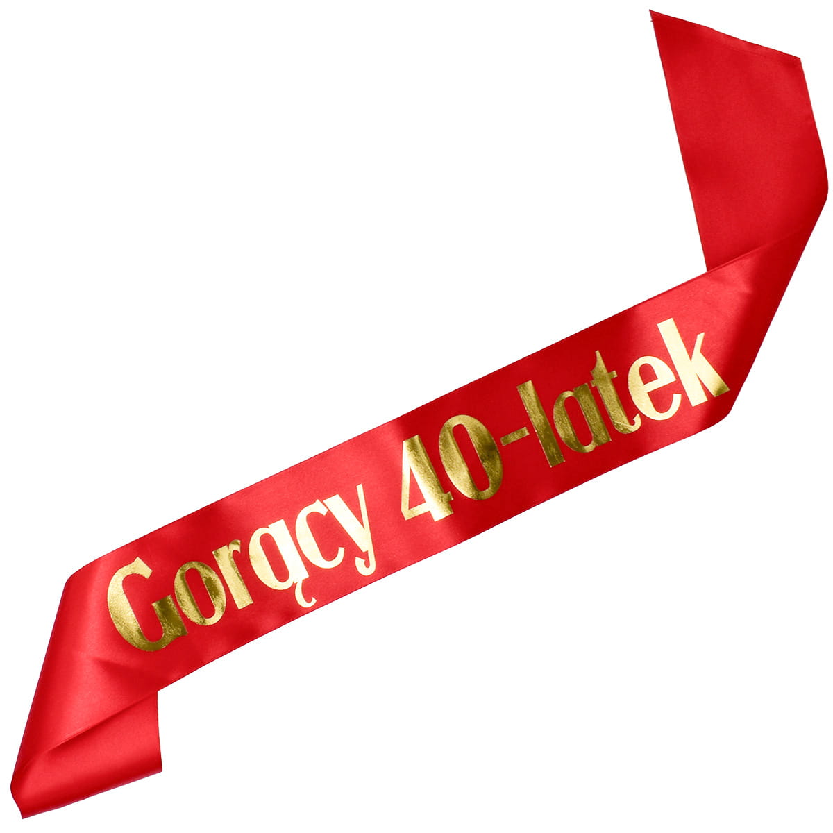 Szarfa satynowa w kolorze czerwonym, z nadrukiem w kolorze złotym o treści Gorący 40-latek, szerokość ok. 10 cm, długość ok. 160 cm (+/- 5%). Szarfa idealnie nadaje się na urodziny, imprezy.
