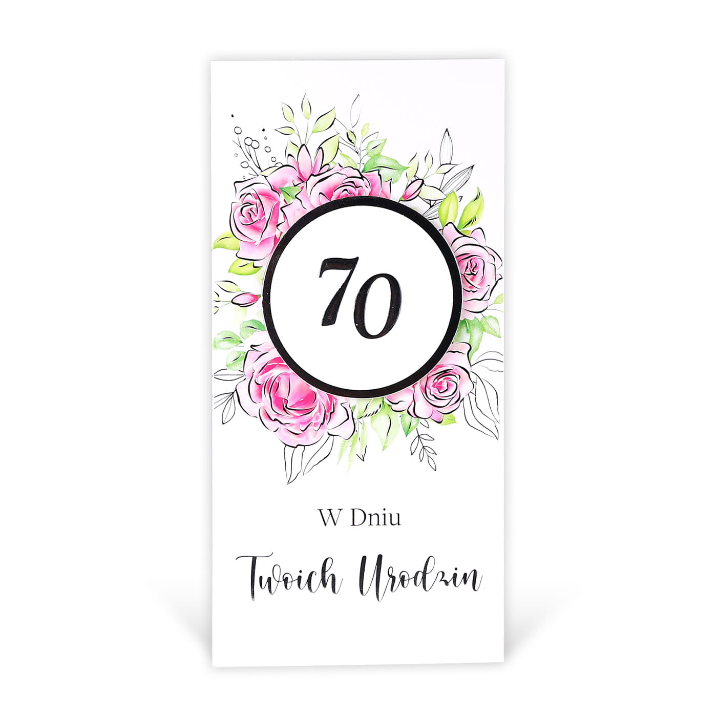 kartka z przestrzenną złoconą etykietą, na której wytłoczona jest cyfra 70 oraz grafika różowych róż.