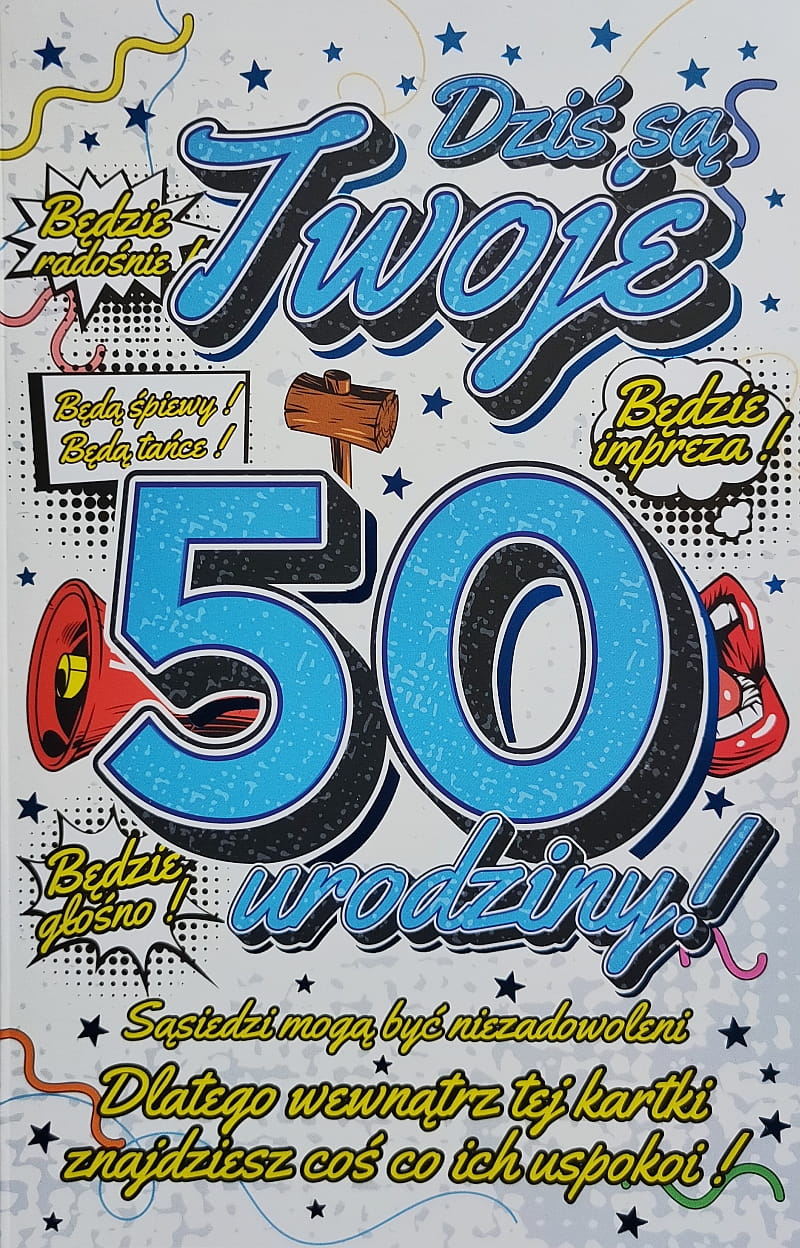 Kartka urodzinowa – 50 urodziny, zawieszka, niebieska