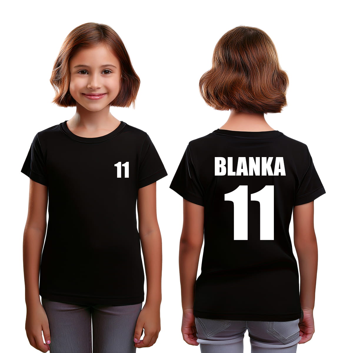 Koszulka z cyfrą od 10 do 99 z przodu i z tyłu oraz imieniem dziecka - czarna z białym nadrukiem